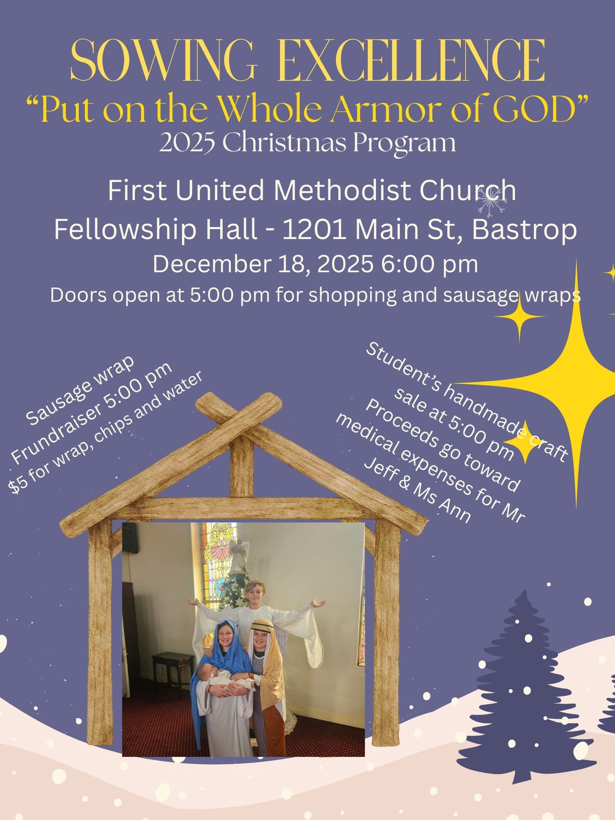 Every year our school puts on a special Christmas play to tell others about the birth of Jesus Christ, with a different theme each year! This year's theme is "Put On the Full Armor of God", wonderfully written by Ms. Oma. We use this as a time to sell crafts that our students created, and we use the proceeds to give to someone in need each year. This year, we are donating the proceeds to our good friends, Ann and Geoff Roberson, to help with their medical bills.